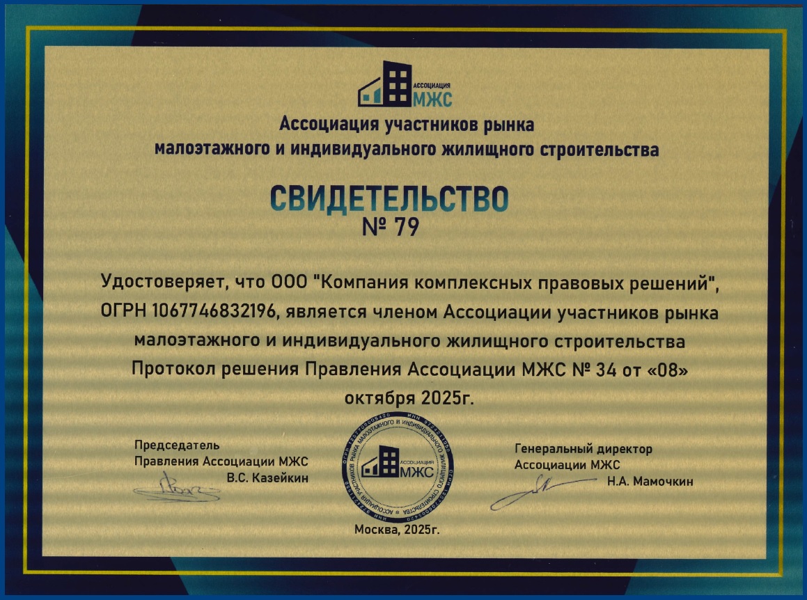 CВИДЕТЕЛЬСТВО № 79 от 08.10.2025 (протокол решения Правления Ассоциации МЖС № 34) Ассоциации участников рынка малоэтажного и индивидуального жилищного строительства | ||