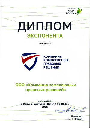 ДИПЛОМ ЭКСПОНЕНТА за участие Компании в Форуме-выставке "ЗЕМЛИ РОССИИ" 2025 | ||